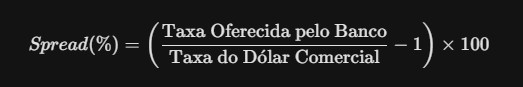 Spread (%) = (Taxa do dólar comercial/Taxa oferecida pelo banco – 1) x 100
